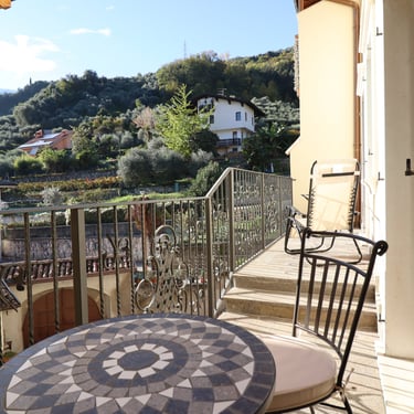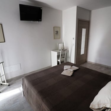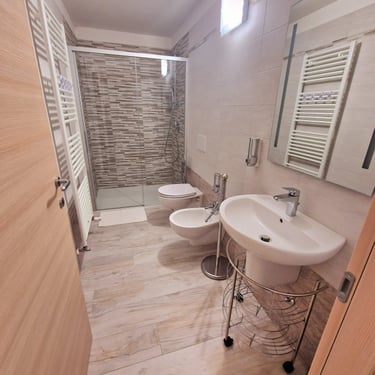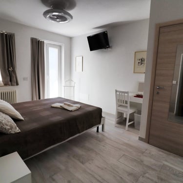 Ampia camera con balcone e vista sui monti, bagno dedicato con grande piatto doccia.